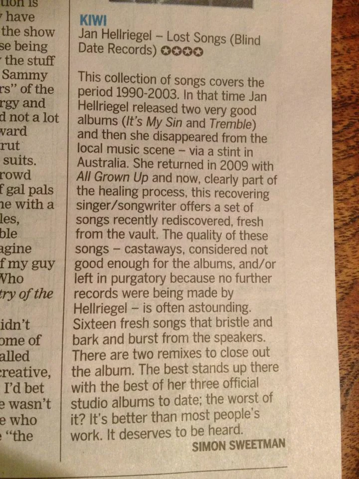 For far too long Jan Hellriegel was known by the shorthand of "Westie singer" which might have been literally true -- she lived in West Auckland, she sang -- but rather diminished her songwriting skills and the power of her delivery...